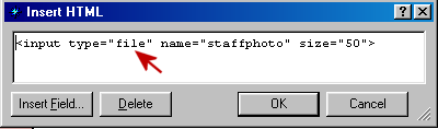 2) In the Insert HTML box, enter your field name, with TYPE='FILE'