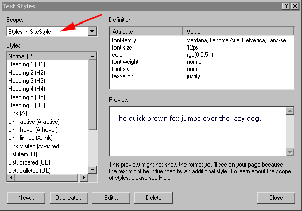 Or, in page view, click the text menu, click text styles, choose Styles in Site Style from the dropdown, start with Normal (P) and work your way down